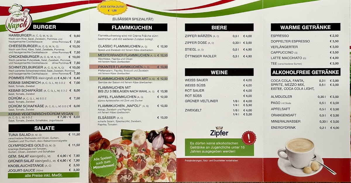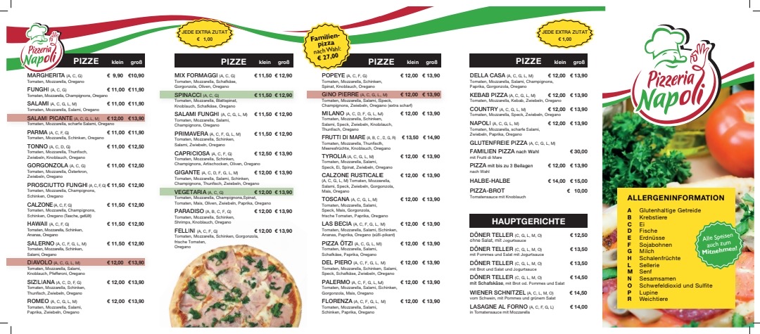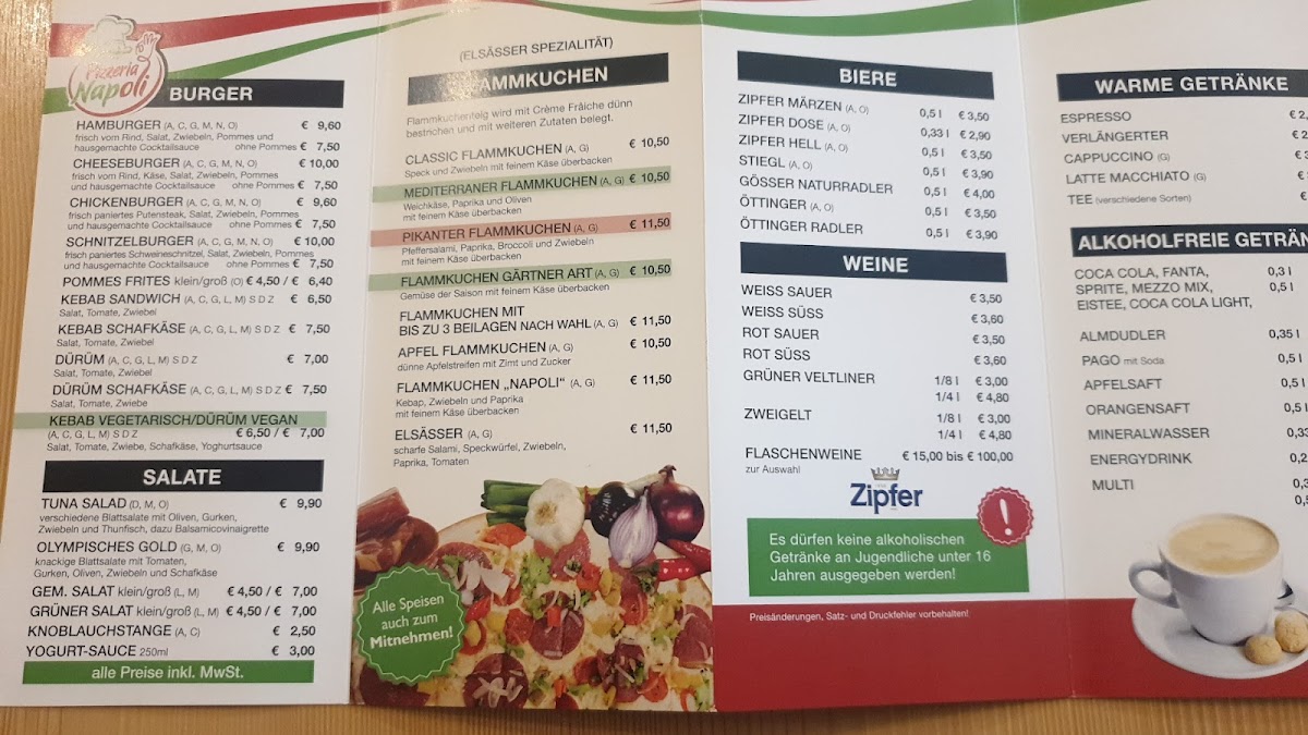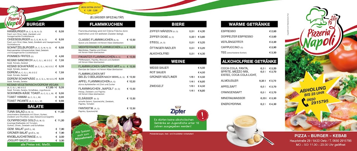 Pizzeria Napoli-Ötz offers a diverse and satisfying menu that caters to a variety of tastes. Their pizza selection stands out with classics like the Capriciosa, a flavorful option topped with ham, mushrooms, and olives, and the Kebab Pizza, which adds a twist with spiced kebab meat. For those looking for something a bit more unique, the Calzone Classico provides a hearty, folded pizza filled with cheese and savory ingredients. If you're in the mood for something more Mediterranean, the Pita is a great choice, offering a deliciously warm, stuffed bread. The Pide is another specialty that features a traditional Turkish flatbread, perfect for those who enjoy a lighter, crispier crust. Complementing these dishes are the Mit Pommes Und, which pairs perfectly with any pizza or kebab dish, and the delicious Knoblauchstange, a garlic bread that is an absolute must-try. With a menu that balances familiar comfort food with exciting new options, Pizzeria Napoli-Ötz is sure to satisfy any pizza lover or those looking to try something different.